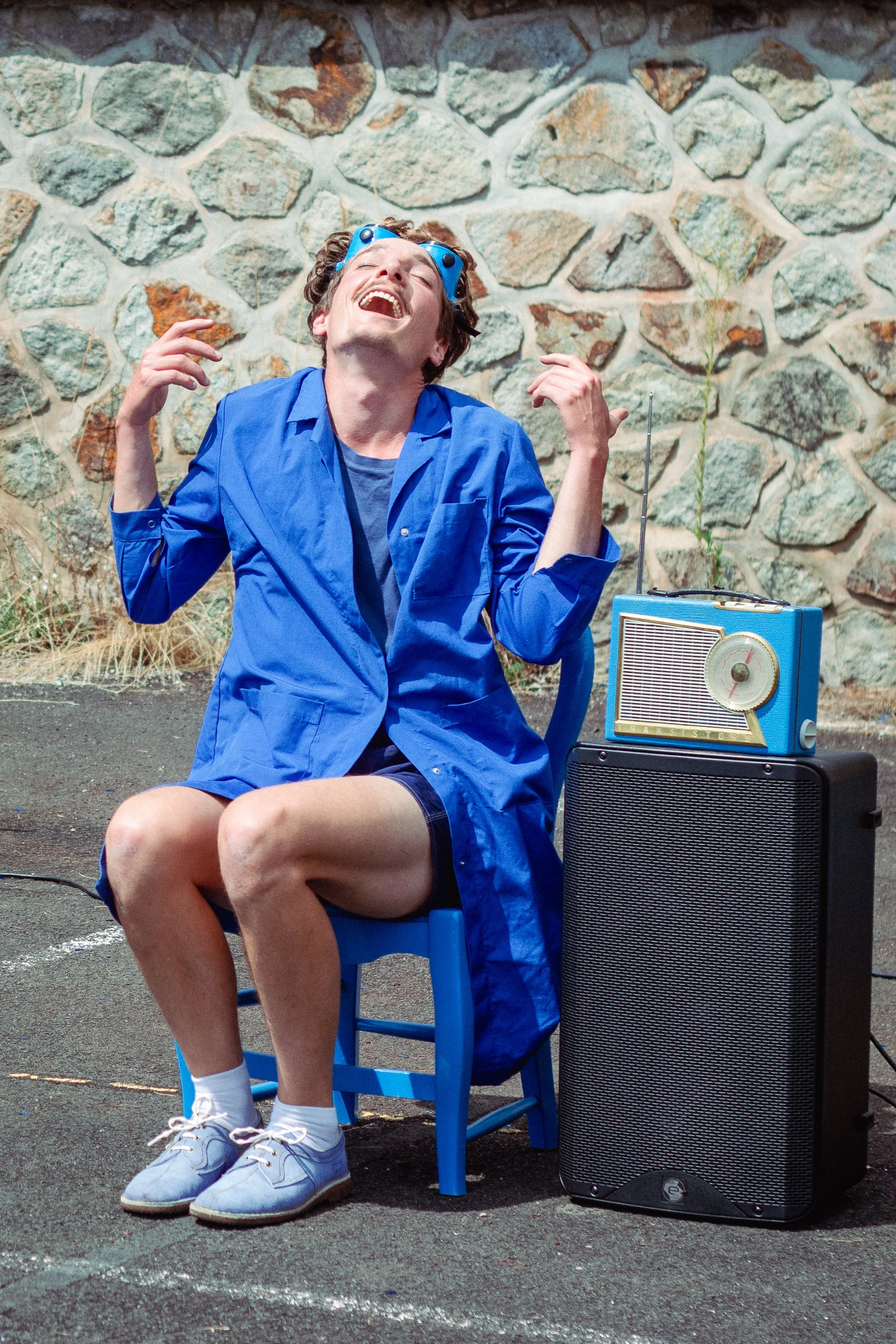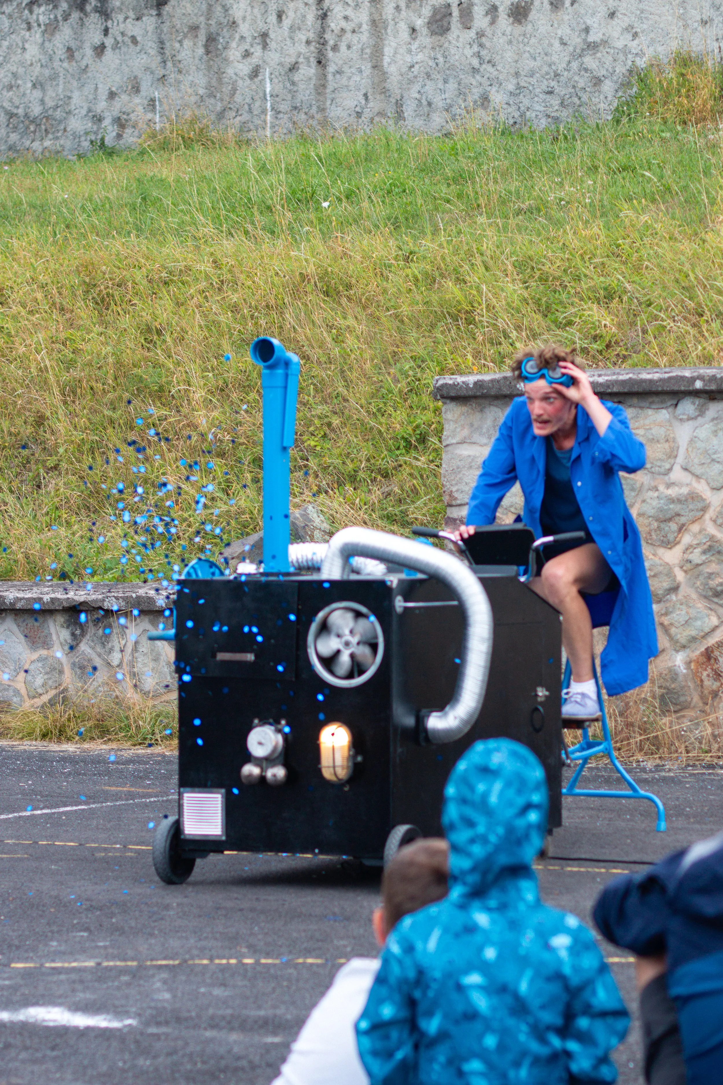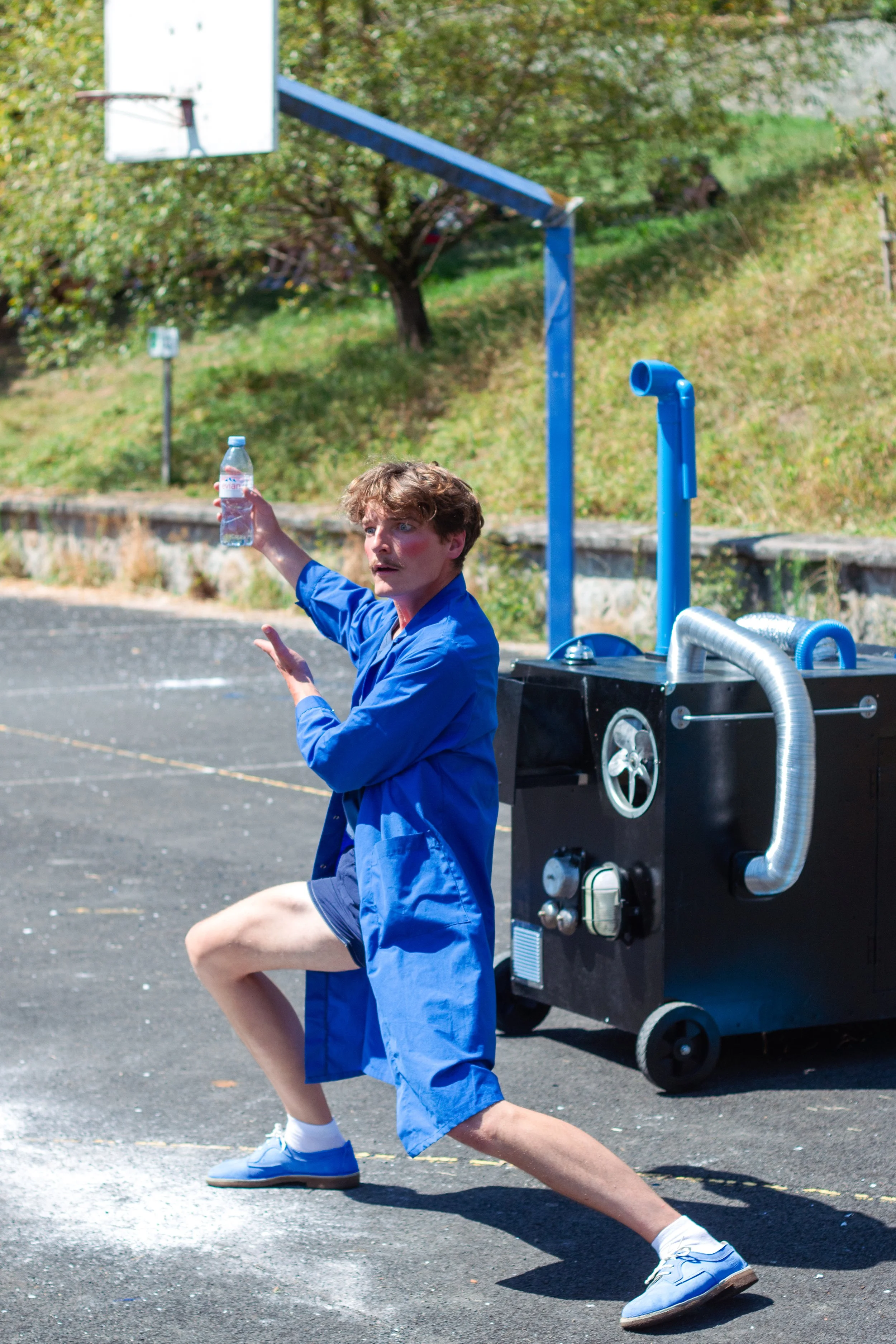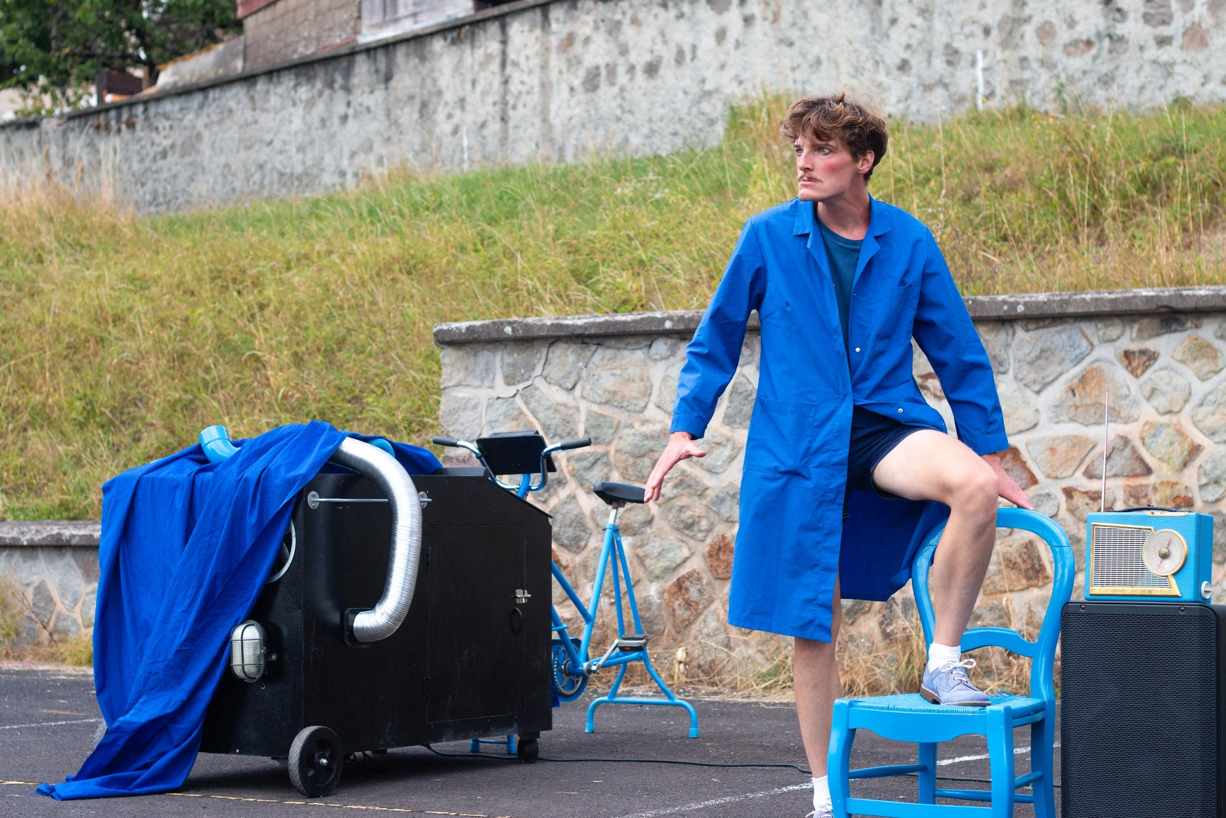 Venu tout droit des abîmes de son atelier, Ernest, créateur à l'esprit excentrique, tente de réaliser une démonstration de son tout dernier chef-d’œuvre, une prodigieuse machine, capable de transformer n'importe quels objets en bleu…